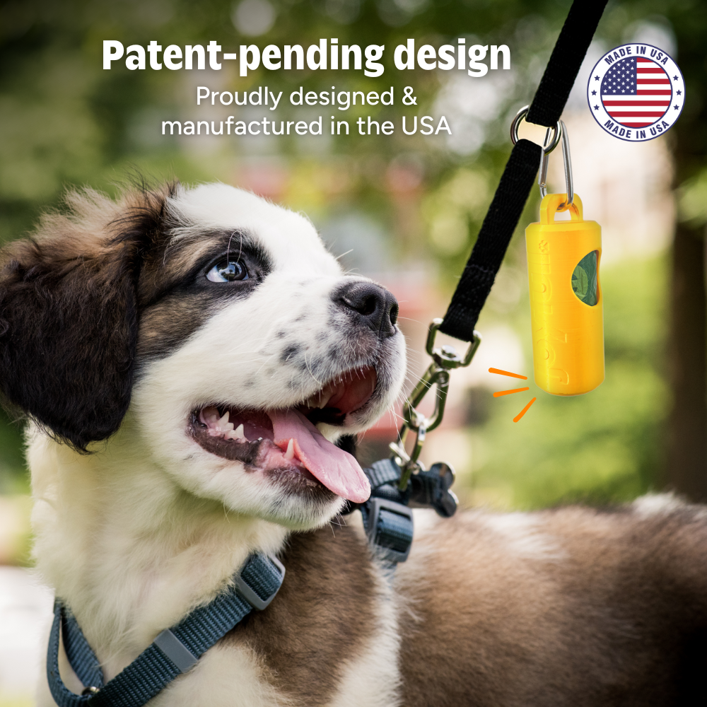 Our patent-pending design solves the problem every dog parent knows too well... that "oh 💩!" moment when your dog's gotta go but your bag roll is empty. Cue the shame spiral and panic.